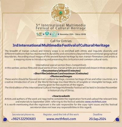 El tercer Festival Internacional Multimedia del Patrimonio Cultural se celebrará en noviembre de 2024 en la provincia de Fars en siete categorías: "Cine, Televisión y Radio", "Obras Digitales Inteligentes", "Artes Escénicas", "Fotografía y Carteles", "Ideas y Experiencias”, “Futuros Protectores de Patrimonio” y “Revisión de Obras Internacionales”. www.mcthfest.com