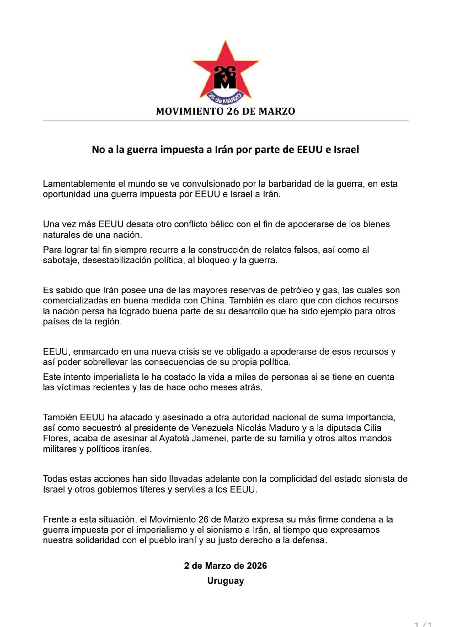 Declaración del Movimiento 26 de Marzo en condena de la guerra impuesta por el imperialismo y el sionismo contra la República Islámica de Irán.